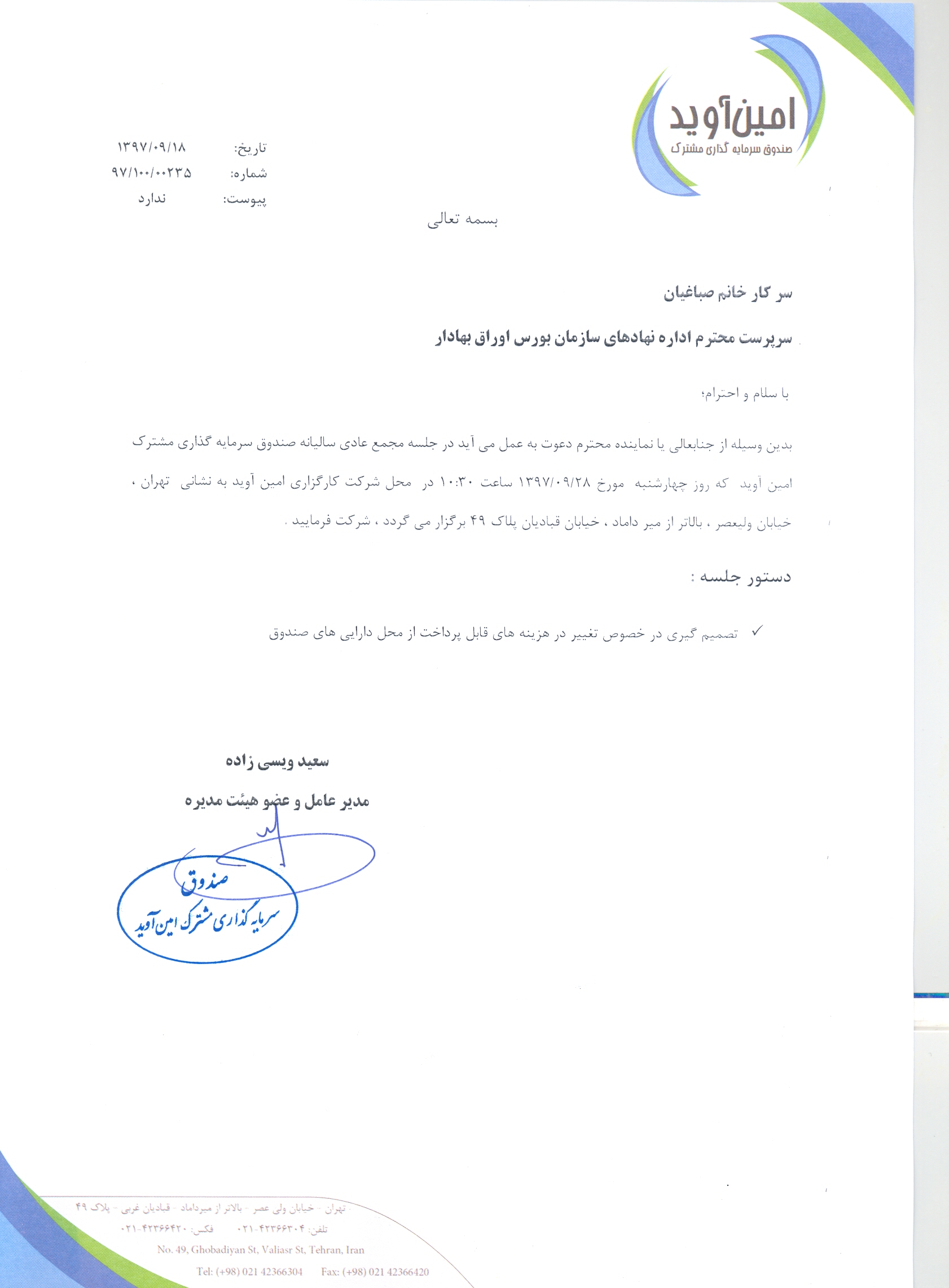 دعوت به مجمع صندوق مشترک امین آوید مورخ 1397/09/28ساعت 10:30