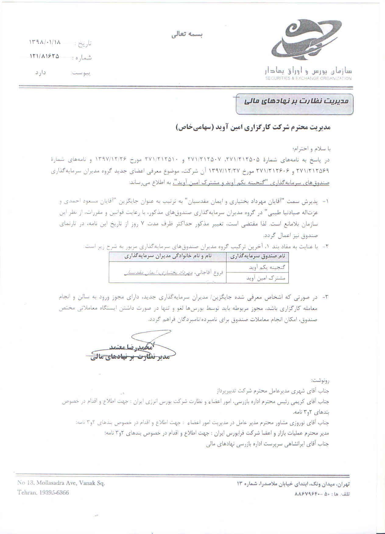 دعوت به مجمع صندوق مشترک امین آوید مورخ 1398/01/18ساعت 11:00