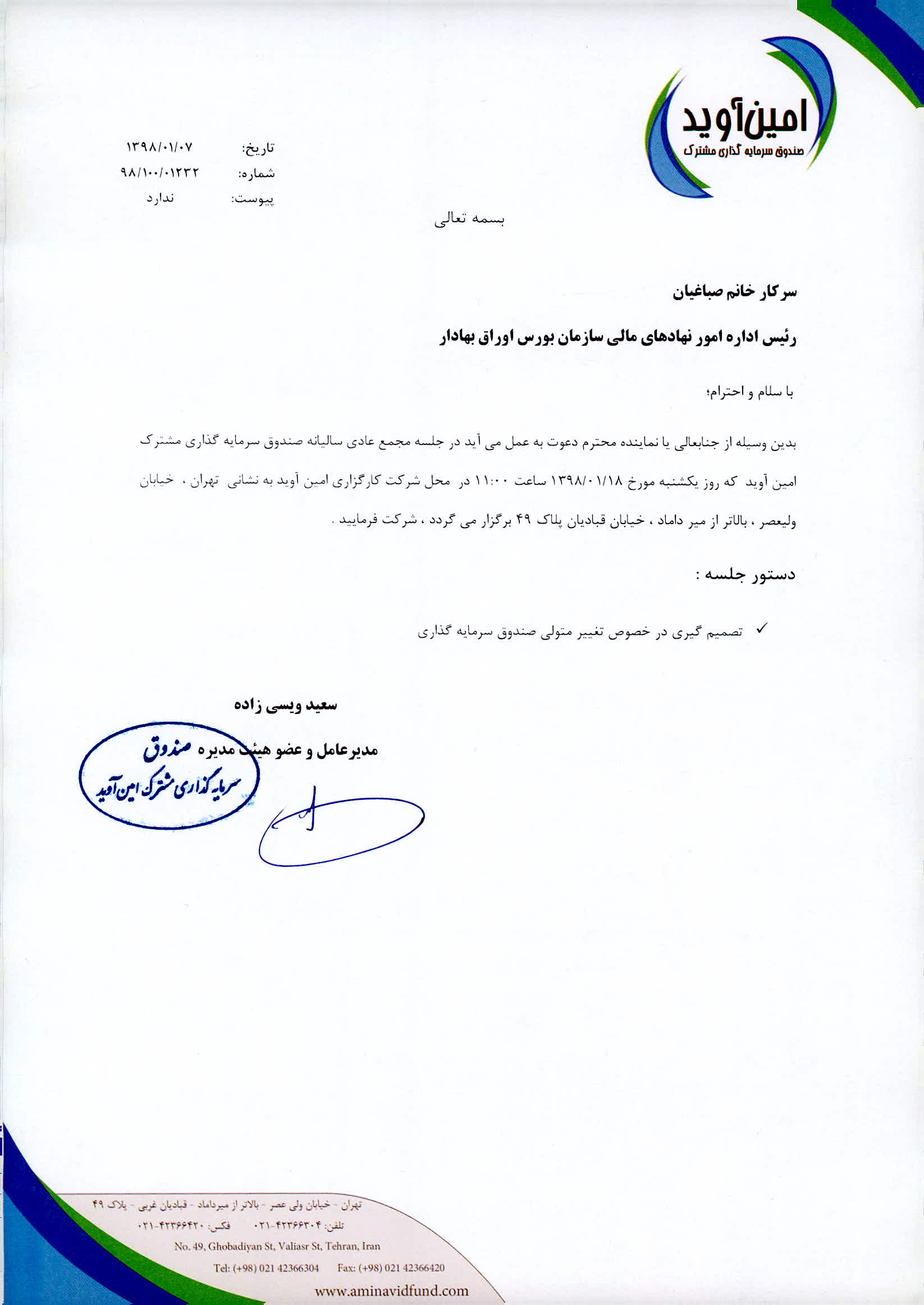 دعوت به مجمع صندوق مشترک امین آوید مورخ ۱۳۹۸/۰۱/۱۸ساعت ۱۱:۰۰