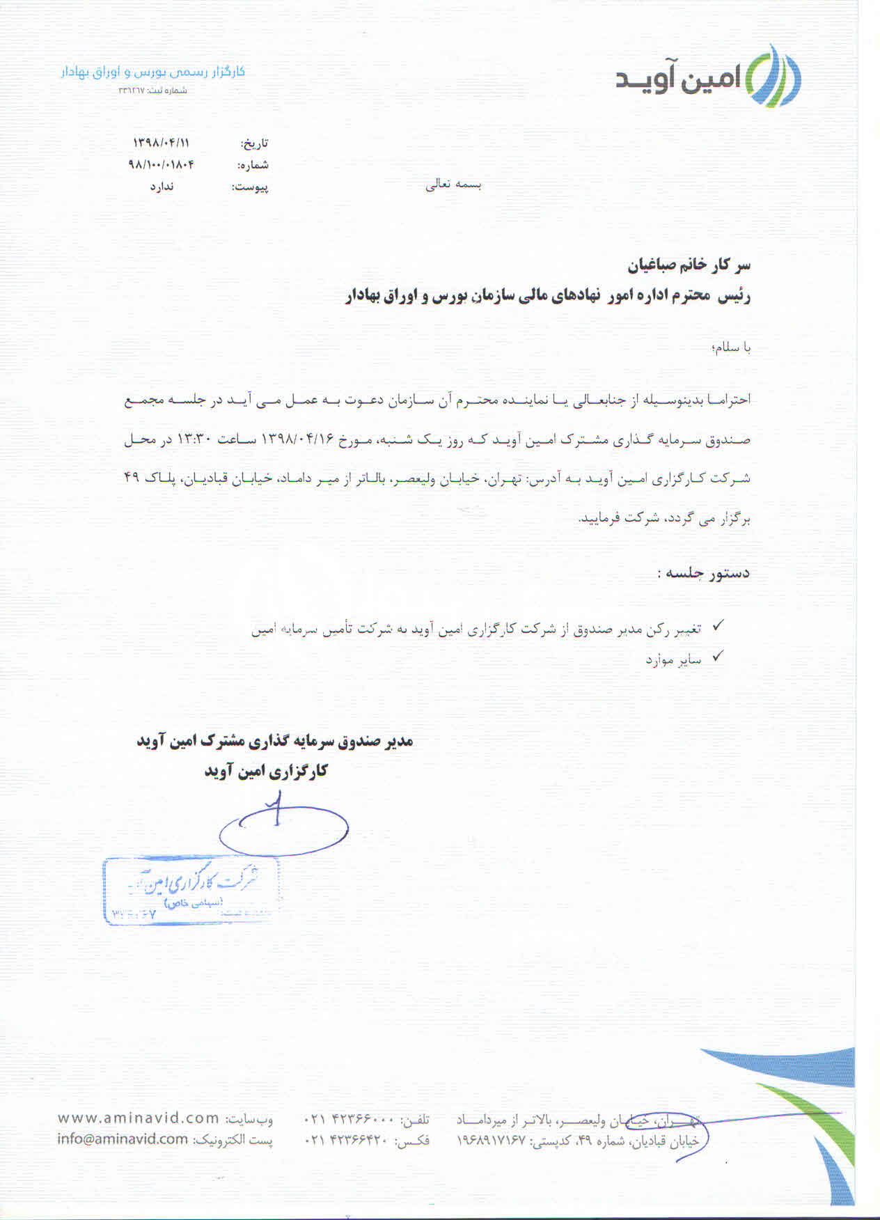 برگزاری مجمع صندوق مشترک امین آوید در تاریخ ۷ تیر۱۳۹۹ ساعت ۱۴:۰۰